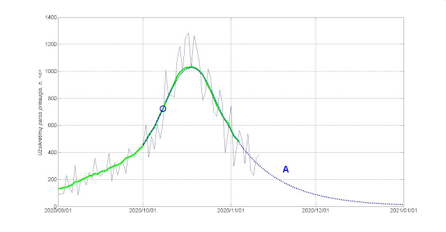Taigi, užsikrėtimų paros prieaugio scenarijai pateikti 2 paveiksle. Kaip matyti, dabartinis optimistinis A scenarijus (2 pav.) yra tik truputi švelnesnis nei anksčiau skelbtas pesimistinis C scenarijus (1 pav.). Dabartinis optimistinio A scenarijaus pagrindinė prielaida, kad žmonės uoliai laikysis 2020-10-28 karantino reikalavimų nuo pat pradžios ir karantino efektyvumas bus -2% užsikrėtimų paros prieaugio mažėjimas, kaip buvo gegužės - birželio mėnesiais per pirmosios bangos karantiną.